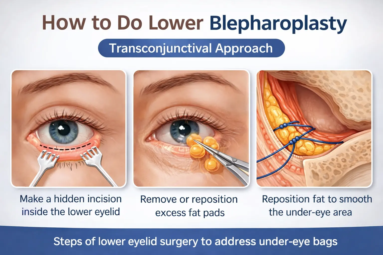 ในปัจจุบัน การแก้ไขอาจไม่จำเป็นต้องตัดไขมันทิ้งเสมอไป แต่หัวใจสำคัญคือการ "จัดเรียงไขมันใต้ตาใหม่" (Lower Blepharoplasty with Fat Repositioning) โดยจักษุแพทย์เฉพาะทางจะใช้วิธี: